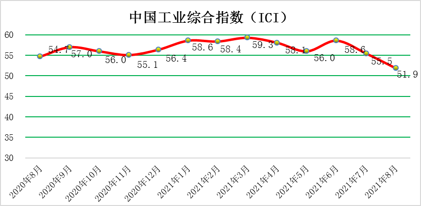 2021年8月份,中國工業綜合指數(以下簡稱ICI)為51.9%,環比回落3.5個百分點,受疫情短期沖擊影響,明顯回落,但自去年4月份以來連續位于榮枯線以上,表明中國工業經濟總體持續恢復。生產狀況指數為55.3%,環比回落13.0個百分點,大幅回落,企業生產擴張明顯放緩。效益狀況指數為45.6%,環比回升0.2個百分點,稍好于上月,小幅回升。經營環境指數為52.0%,環比回升3.3個百分點,回升至榮枯線之上,經營環境得到改善。融資難易指數為47.8%,環比回升5.5個百分點,持續位于榮枯線下方,該指數較大回升接近50%的均衡線,表明當前企業融資難融資貴的問題有較大改善,但依舊需要政府進行干預、發揮作用。預期發展指數為55.9%,環比回落4.0個百分點,有所回落但該指數依舊保持較高位優勢。ICI制造業指數為52.6%,環比回落4.2個百分點,受短期疫情影響,不再維持高位,但自去年4月份以來連續位于榮枯線以上,表明制造業總體持續穩定復蘇。