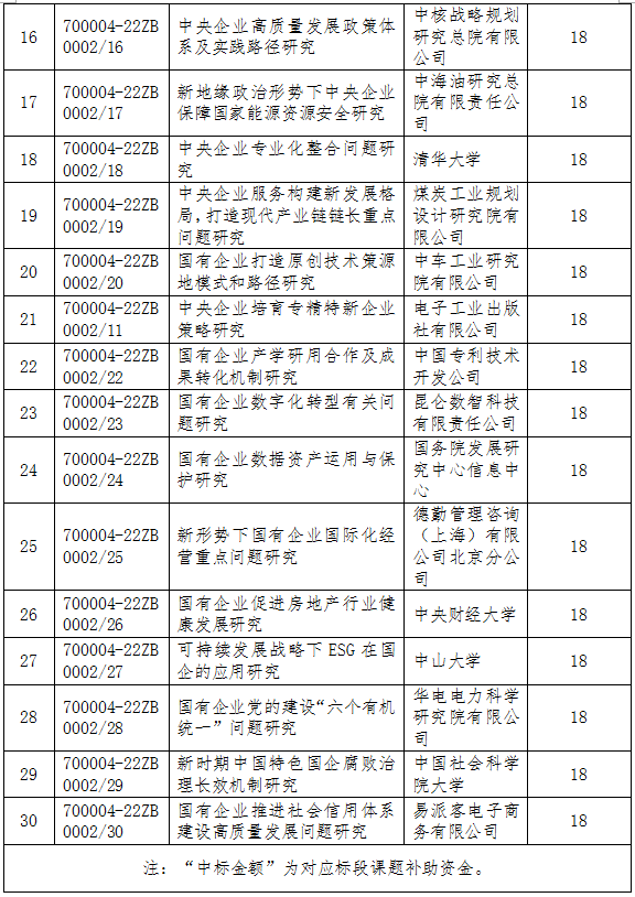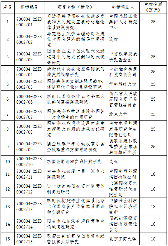 受國務院國有資產監督管理委員會研究中心和商業信用中心委托,北京軟件和信息服務交易所有限公司通過北交所電子采購平臺組織的國務院國資委2022年度研究課題(項目編號:700004-22ZB0002/01-30)已完成評標工作,現將結果公示如下: