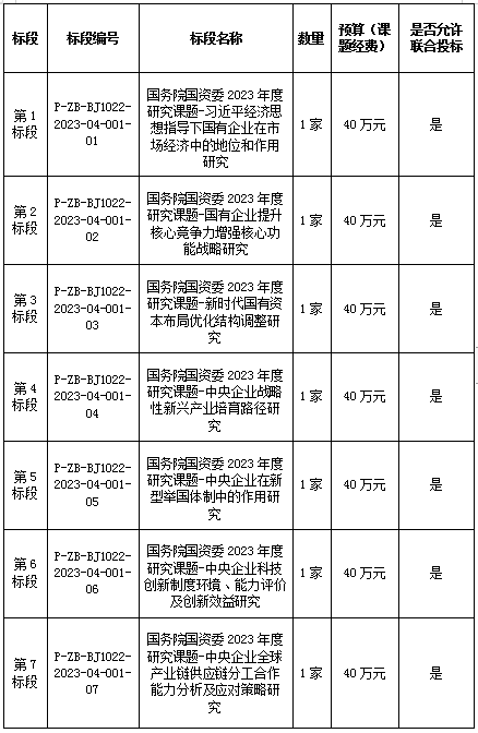 3.4 投標(biāo)人其他要求:(1)課題申報(bào)以單位為主體,鼓勵(lì)跨單位、跨領(lǐng)域、跨學(xué)科開展聯(lián)合研究;(2)在相關(guān)研究領(lǐng)域具有較強(qiáng)的科研力量和深厚的學(xué)術(shù)積累;(3)能夠?yàn)殚_展重大項(xiàng)目研究工作提供良好條件;(4)鼓勵(lì)中標(biāo)單位提供配套研究費(fèi)用;(5)須按照選題說明和招投標(biāo)相關(guān)要求,組建課題組,按照發(fā)布的選題研究方向填寫《國(guó)務(wù)院國(guó)資委2023年度研究課題申請(qǐng)書》;(6)建議投標(biāo)人集中研究力量聚焦1個(gè)標(biāo)段進(jìn)行投標(biāo)。