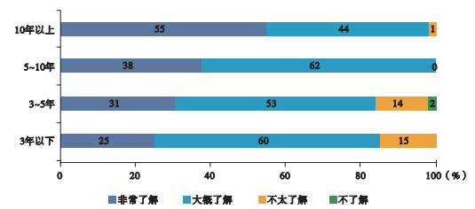 對東道國環境相關法律法規的了解程度(按海外業務年限劃分)