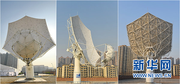 這是SKA——平方公里陣列射電望遠鏡首臺天線樣機的正面(左)、側(cè)面(中)和背面(2月6日攝,拼版照片)