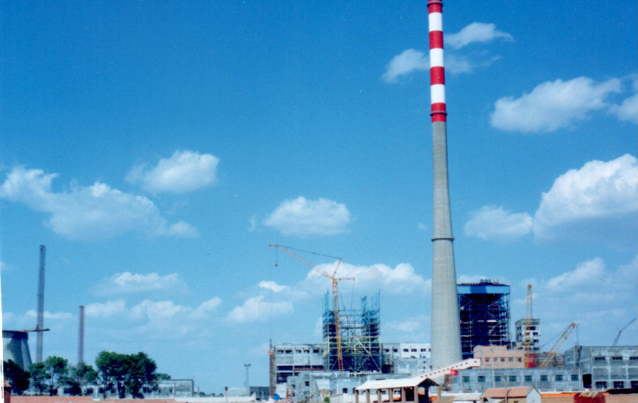 上世紀90年代初期萊蕪電廠工人正在進行冷卻塔內(nèi)部防腐施工