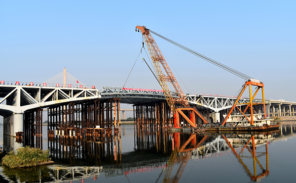 由中國鐵建所屬中鐵十五局負(fù)責(zé)施工的海河特大橋位于津南區(qū)與濱海新區(qū)交匯處,全長1640米,主橋采用3跨鋼混組合連續(xù)桁架結(jié)構(gòu)橫跨海河,用鋼量1.2萬噸。該橋設(shè)計(jì)新穎、結(jié)構(gòu)復(fù)雜、技術(shù)含量高、施工難度大,是濱海新區(qū)和全線重點(diǎn)建設(shè)項(xiàng)目。