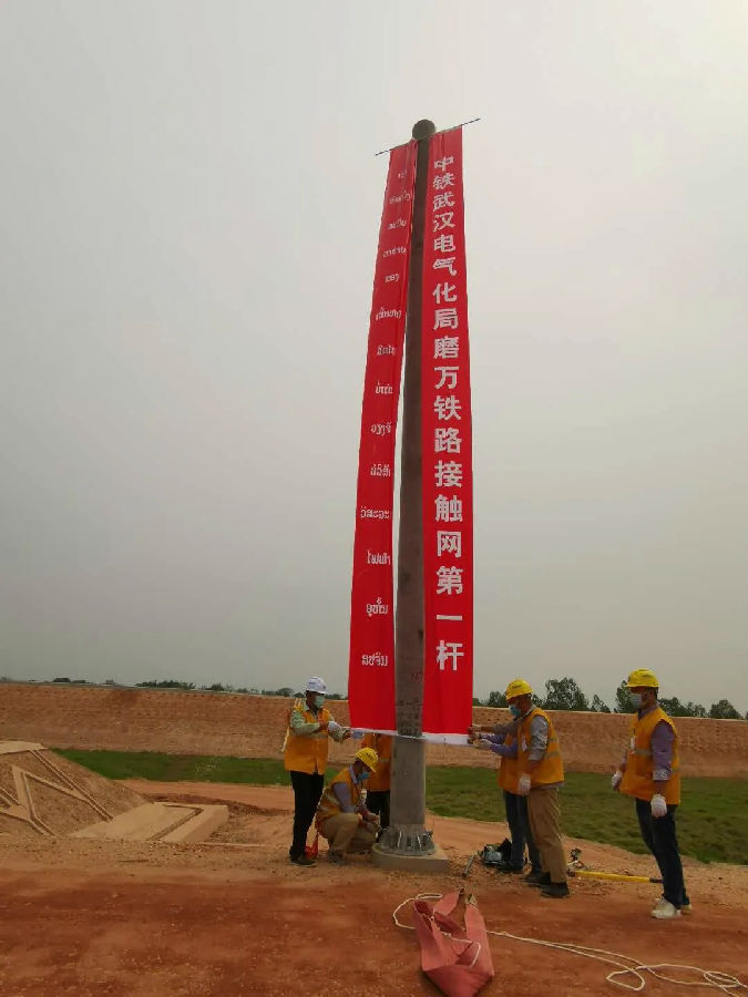 3月15日上午,在老撾豐洪,中國中鐵武漢電氣化局組立中老鐵路站后接觸網工程第一桿,標志著中老鐵路項目電氣化工程正式進入施工階段。測溫、消毒、安全大點名、支柱組立、測溫、消毒、退場,站后電氣化開工儀式一氣呵成,老撾當地對中國中鐵建設者們展現的專業素養表示贊賞。