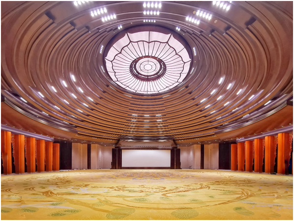 西安三中心項目涉及多個高大空間營造。圖為國際會議中心圓桌會議廳,左右各九根立柱支撐起九層穹頂,整廳橫跨48米,層高18米