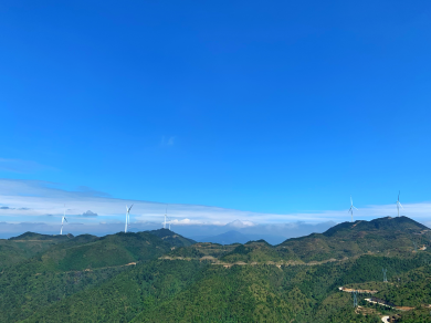 中核匯能富川風電場,39臺不同容量的風力發電機組錯落有致地坐落在30余平方公里的連綿丘陵上。作為中核集團在桂的第一個新能源發電項目,嚴格執行環境保護“三同時”,即建設項目中防治污染的措施,必須與主體工程同時設計、同時施工、同時投產的工作原則。