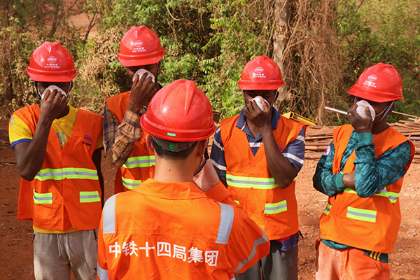 中鐵十四局達圣鐵路項目部在施工期間,為幾方員工配發了防疫口罩,并現場示范口罩正確佩戴方式