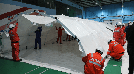 4月4日上午,振華重工接到建設氣膜方艙的任務,緊急召開抗疫援建專項會議,長興分公司迅速響應,抽調近百人的隊伍火速支援上海氣膜方艙建設。在確定氣膜方艙建設方案后,振華重工僅用了4個小時就完成隊伍組建及后勤保障工作。通過不間斷作業并同步優化作業方案,最終僅用6小時就提前完成援建任務,較廠家預估的作業時長減少一半,在有效減少援建隊、醫療隊共區伴隨的同時,也為后續進行醫療氣密試驗、負壓實驗預留了充足時間。