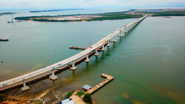 文萊大摩拉島大橋項(xiàng)目全長(zhǎng)5915米,為雙向四車道公路,主要包括一座長(zhǎng)2680米的跨海大橋,其主橋?yàn)檫B續(xù)剛構(gòu),引橋?yàn)楣?jié)段預(yù)制拼裝。大橋建成后將成為文萊首座跨海特大橋梁,大摩拉島將告別無(wú)橋梁連接文萊大陸的歷史,這對(duì)推進(jìn)文萊城市發(fā)展、開(kāi)發(fā)大摩拉島石油和天然氣資源具有重要意義。