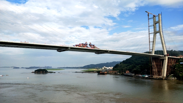 長門特大橋是福州繞城高速公路東南段項目重要的控制性工程,主橋全長848米,為雙塔雙索面混合梁斜拉橋。該橋是國內(nèi)采用塔梁墩固結(jié)體系的最大跨徑斜拉橋,也是同體系世界第二大跨徑斜拉橋,是國內(nèi)近海大跨度斜拉橋該結(jié)構(gòu)體系的首次嘗試,對沿海地區(qū)斜拉橋抗風設(shè)計有著突破性的意義。