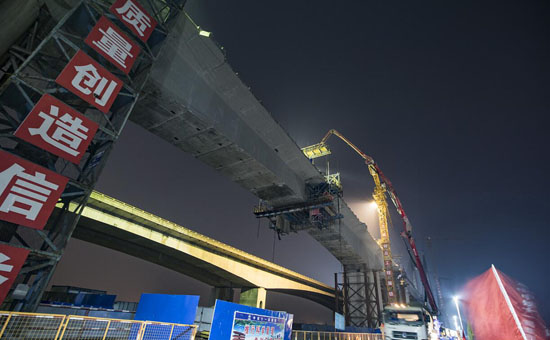 建設者們在蒙華鐵路漢江特大橋合龍段進行混凝土澆筑作業 徐云華 攝