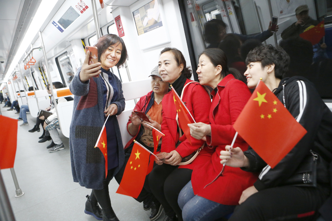 乘客們興奮的乘坐從八樓站開往國際機場站的新疆第一條地