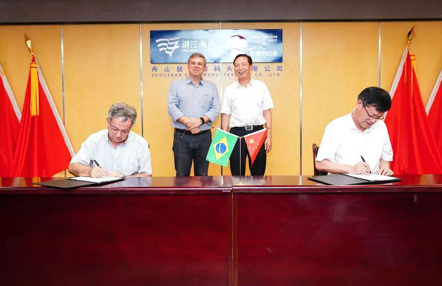 8月16日,浙江省海港集團(寧波舟山港集團)與巴西淡水河谷公司在舟山鼠浪湖礦石中轉碼頭簽署諒解備忘錄,進一步深化雙方合作。