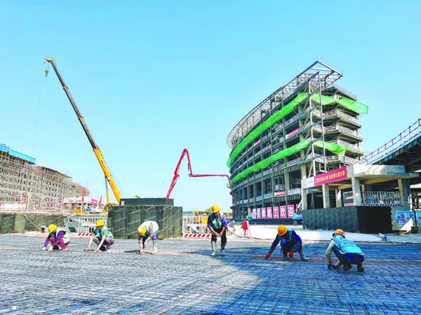 建設團隊錨定“地下車庫地坪澆筑完成”、“旅客過夜用房樓層板全部澆筑完成”階段性目標,科學調配資源,輪班作業,現場投入吊車、泵車等大型機械十余臺,統籌抓好安全管理、質量監督、進度推進。