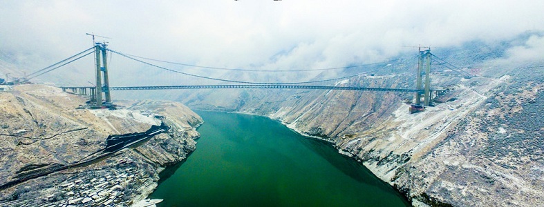 2月6日,由四川公路橋梁建設集團有限公司承建的雅康高速公路瀘定興康特大橋隨著最后一段鋼桁梁被吊裝到位,橋身主體結構順利實現合攏。該橋位于瀘定大渡河峽谷,位于高海拔、地震高烈度地區,施工條件艱難,峽谷風場紊亂,全長1411米,主跨1100米,采用鋼混疊合橋道系,總造價超過10億元,被譽為“川藏第一橋”,預計2018年8月底實現貫通。
