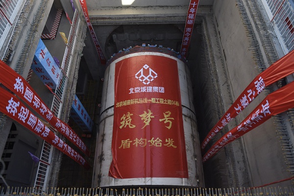 2月7日,8.8米直徑的盾構機“筑夢號”在正在建造中的北京軌道交通新機場線一期工程磁各莊站正式始發。