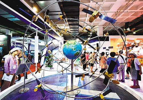參觀者在第二十屆中國北京國際科技產業博覽會上參觀展出的北斗衛星導航系統模型。(鞠煥宗攝)