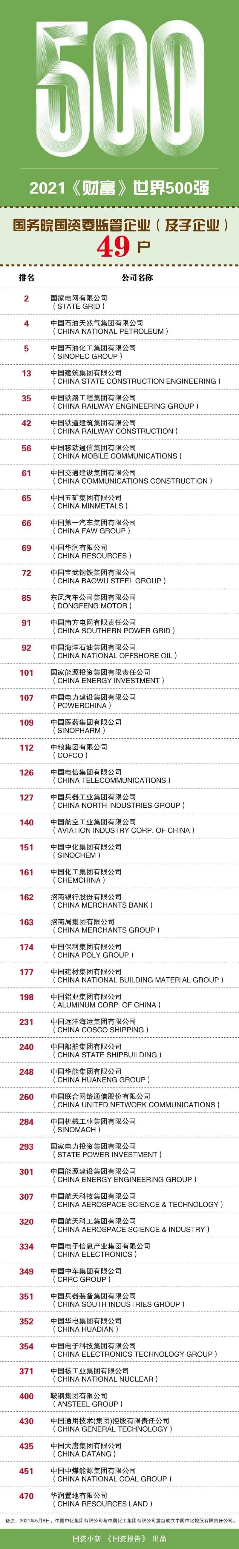北京時間2021年8月2日,《財富》官方APP發布了最新的《財富》世界500強排行榜。中國大陸(含香港)上榜公司數量連續第二年居首,達到135家,比上一年增加11家。加上中國臺灣地區企業,中國共有143家公司上榜。