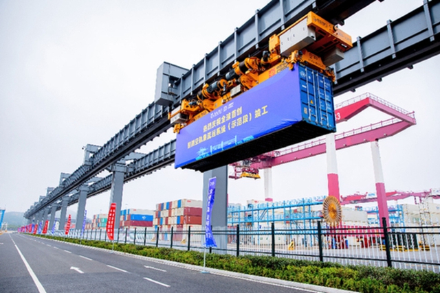 今年6月,全球首創智能空中軌道集疏運系統(示范段)在山東港口青島港自動化碼頭竣工投入試運營。資料照片