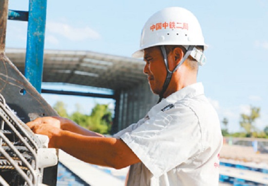 距離施工現場不遠處,是中鐵二局六標二分部的鐵軌制造基地,鋪設在橋梁墩臺上的一段段鐵軌就是在這里生產出來的。據中鐵二局六標二分部工程部部長官必忠介紹,這種“軌道橋梁不分家”的做法,為中老鐵路建設所獨有。“等架梁工作完成后,我們這里的鐵軌就直接運輸過去鋪設了,不僅節(jié)省了運輸成本,而且在老撾生產鐵軌也拉動了當地就業(yè)和材料銷售?!惫俦刂抑钢贿h處正在為基地生產出來的第一條鐵軌進行安全檢查的工人說,“他們都是老撾當地人”。據了解,中老鐵路施工全線帶動了當地近5000人的就業(yè)。