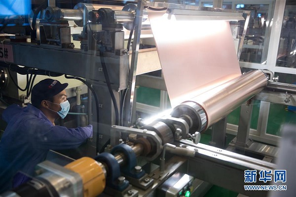 在安徽省銅陵市華創(chuàng)新材料有限公司生產車間,一名員工在監(jiān)測鋰電銅箔生產過程(8月8日攝)。新華社記者 金立旺 攝