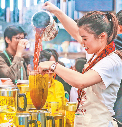 食品及農(nóng)產(chǎn)品展區(qū),參展人員制作“金茶王”港式奶茶。(新華社記者 殷 剛攝)