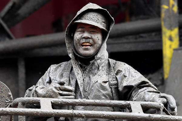 在泥漿中摸爬滾打一整天,工人們一個個都成了“泥人”。