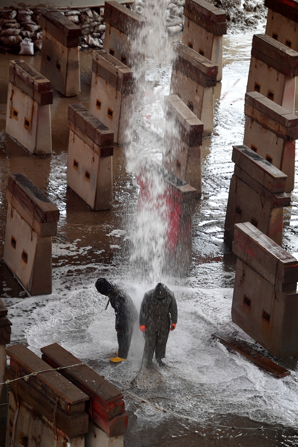 盡管攻堅場景處處有,但令我念念不忘的,還是干塢底部那個最不起眼、最沒含金量的作業項目清洗樁靴。