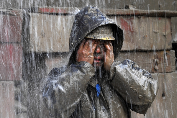 我望著滿天飛濺的泥點子落在工人身上,身穿雨衣的他們一次次變成泥塑;看著橫流的泥水,順著他們的臉流進里面的衣服,又從他們腳下的靴子