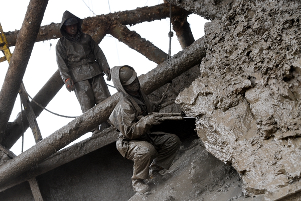 工人拿著高壓水槍在泥中奮戰,一點一點的撥開淤泥。