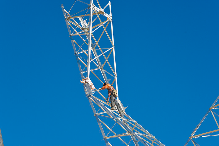 組塔的速度相對要快很多。各類塔材先在施工現場進行地面組裝,完成后將各個部件用吊車進行拼接。盡管當地一天的有效施工時段只有四五個小時,但組塔總過程一般只需兩三天。