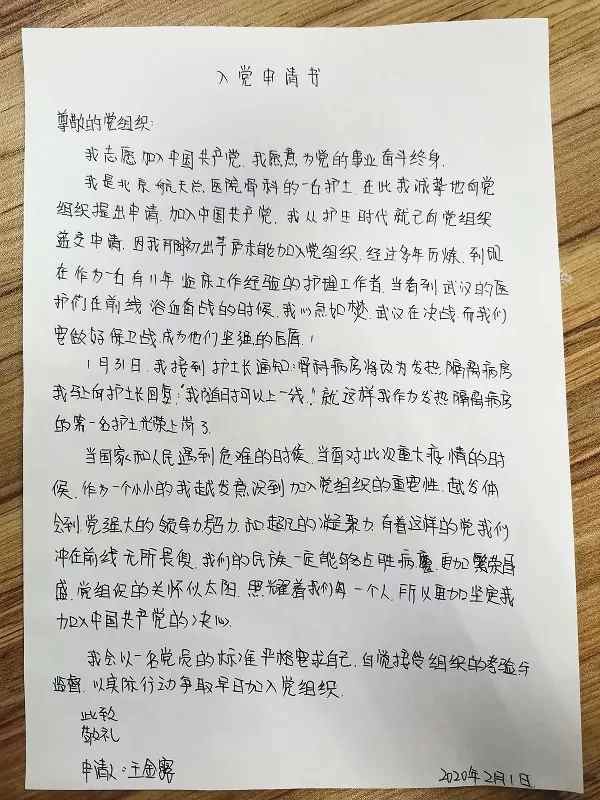 就在那天,王金露鄭重寫下了入黨申請書。申請書上寫著:當面對疫情的時候,作為一個渺小的我,越發意識到黨組織的重要性,越發體會到黨強大的領導力、號召力和凝聚力。