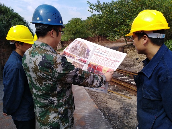 中國鐵物鷹防公司生產支部黨員休息間隙看報學習十九大精神