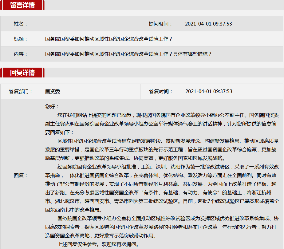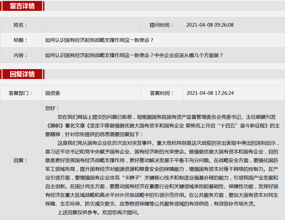 2021年4月國資委網站政務咨詢欄目部分網友提出的咨詢,我們初步做出了認真的回應,現選擇五條關注度高、點擊量高的問題,再次推薦分享。