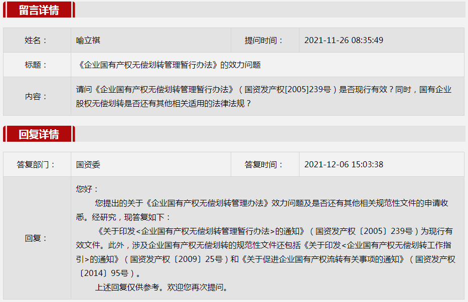 5.《企業(yè)國(guó)有產(chǎn)權(quán)無(wú)償劃轉(zhuǎn)管理暫行辦法》的效力問(wèn)題