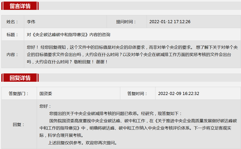 1.對《央企碳達峰碳中和指導意見》內容的咨詢。