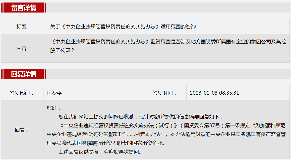 2.關(guān)于《中央企業(yè)違規(guī)經(jīng)營(yíng)投資責(zé)任追究實(shí)施辦法》適用范圍的咨詢。