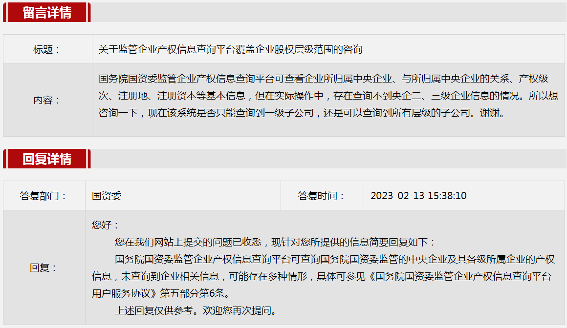 5.關(guān)于監(jiān)管企業(yè)產(chǎn)權(quán)信息查詢平臺(tái)覆蓋企業(yè)股權(quán)層級(jí)范圍的咨詢。