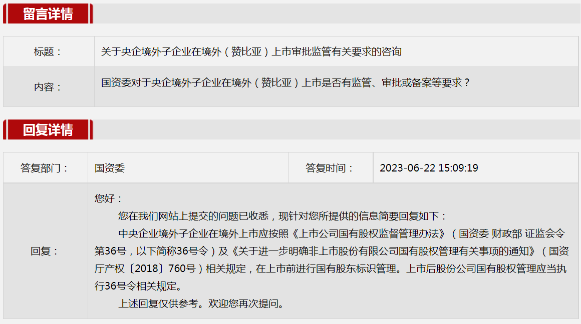 5.關(guān)于央企境外子企業(yè)在境外(贊比亞)上市審批監(jiān)管有關(guān)要求的咨詢。