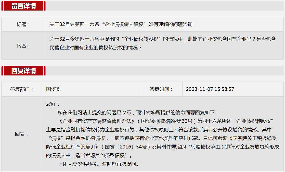 2.關(guān)于32號令第四十六條“企業(yè)債權(quán)轉(zhuǎn)為股權(quán)”如何理解的問題咨詢。