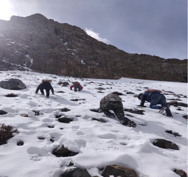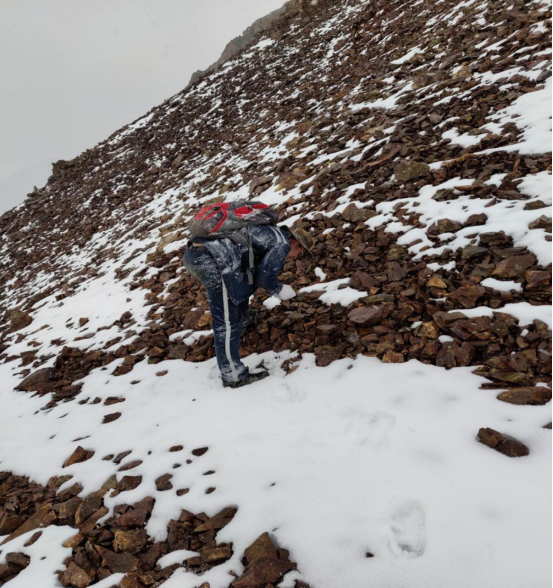 這張照片把我帶到2019年的一個清晨,我們要對ZH1化探綜合異常進行檢查,并在較好的礦化地段進行采樣工作,我早早起來組織項目人員做好工作準備。ZH1化探綜合異常位于西藏拉薩巴嘎拉礦區中部,接近山頂的一條蝕變帶中,山體坡角在30°以上,攀爬起來比較困難,再加上前幾天剛下了兩場大雪,使得攀爬更為艱難。但是困難并沒有阻止我們前進的腳步,我們一行人互相攙扶,一路有說有笑,累了就找個好點的地方,躺在雪上休息片刻,便繼續前行。記得那天我在爬山時一不小心踩到了一個坑,當時我就被雪掩埋了,就剩胸部以上露在外面,同事們發現后,緊張地跑過來把我從雪坑里刨了出來,我們幾個人躺在雪上哈哈大笑,真真是“累并快樂著”。經過一個半小時的攀爬,深一腳淺一腳的,我們終于來到了異常中心,大家共同努力,很快解決了問題。