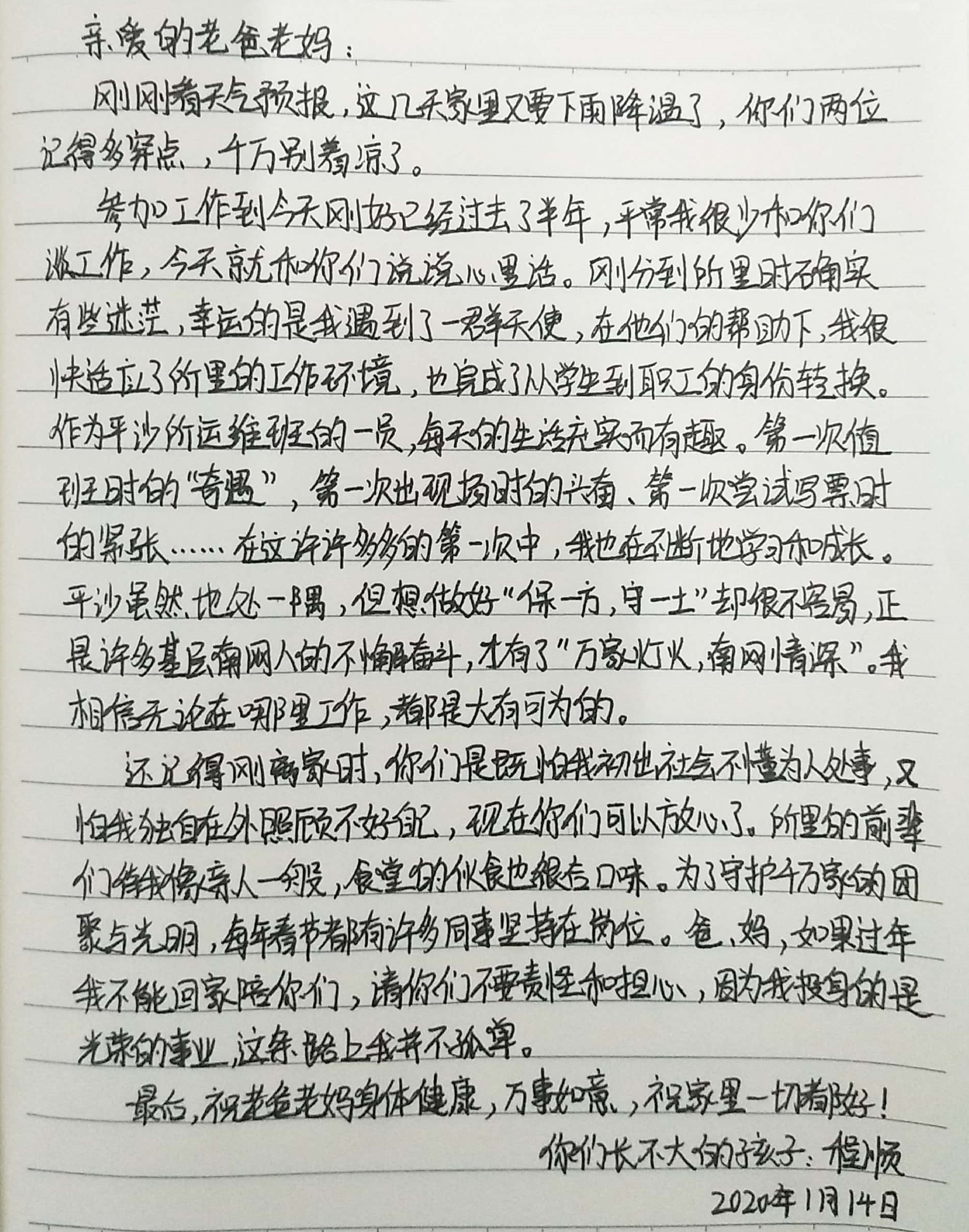 還記得剛離家時,你們是既怕我初出社會不懂為人處事,又怕我獨自在外照顧不好自己,現在你們可以放心了。所里的前輩們待我像親人一般,食堂的伙食也很合口味。為了守護千萬家的團聚與光明,每年春節都有許多同事堅守在崗位。爸、媽,今年過年我可能不能回家陪你們一起過年,請你們不要責怪和擔心,因為我投身的是光榮的事業,這條路上我并不孤單。