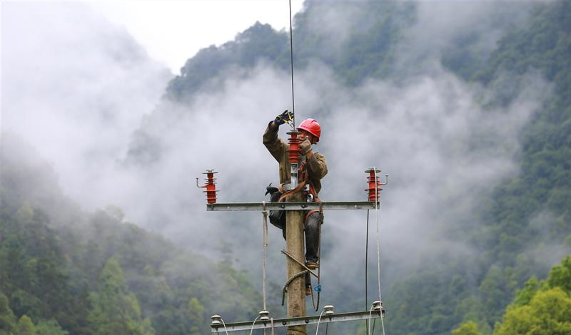 “這幾個(gè)電工在桿子上淋了幾個(gè)鐘頭的雨,喊他們下來(lái)躲雨都不下來(lái)!”作業(yè)點(diǎn)附近的村民楊紹蘭很心疼這些“電騾子”。