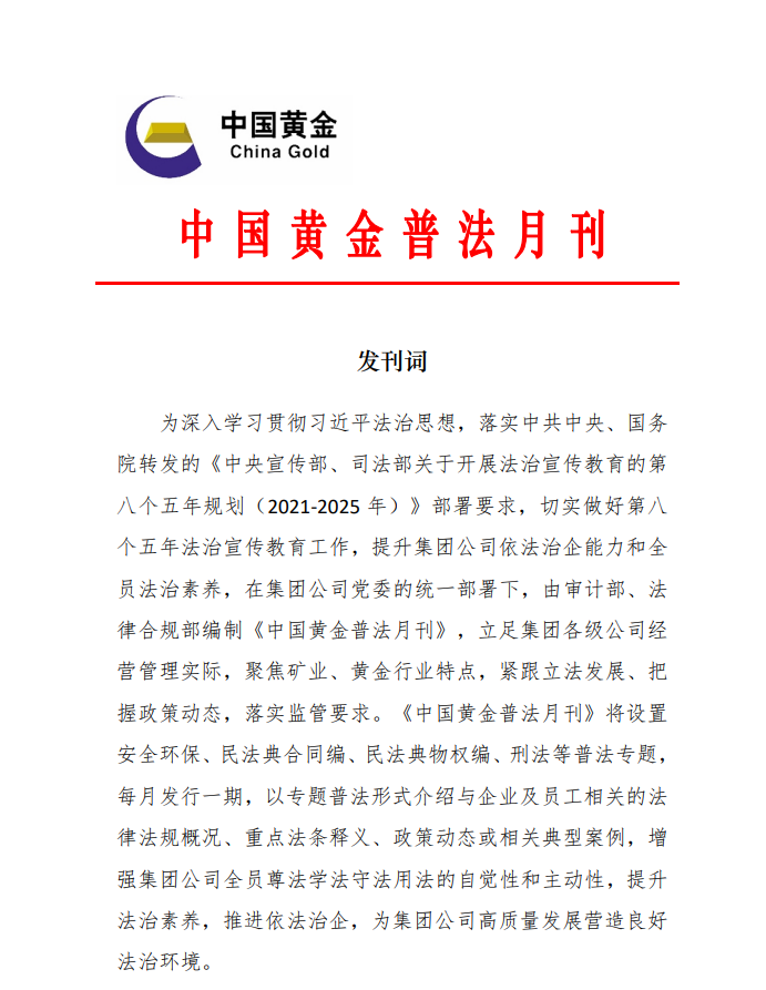為深入貫徹落實習近平生態(tài)文明思想和習近平法治思想,落實習近平總書記“用最嚴格制度最嚴密法治保護生態(tài)環(huán)境”的要求,提高中國黃金集團公司依法治企能力和全員法治素養(yǎng),把生態(tài)環(huán)境保護理念貫穿到發(fā)展各領域全過程,集團公司編制印發(fā)《中國黃金普法月刊》,月刊從企業(yè)實際出發(fā),聚焦礦業(yè)、黃金行業(yè)特點,緊跟立法發(fā)展、政策動態(tài)與監(jiān)管要求,用法治思維和方式推進落實中央生態(tài)環(huán)境保護督察整改工作。