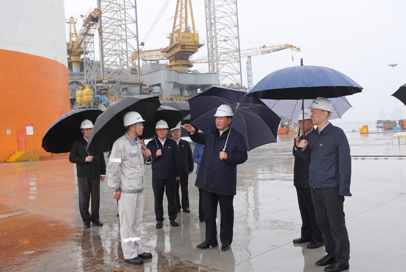2018年6月13日,習近平來到中集來福士海洋工程有限公司煙臺基地。作為國內率先進入海洋工程行業的企業,中集來福士用10年左右時間,國產化率從不足10%提高到60%。在廠區碼頭上,習近平撐著雨傘,趟著積水,近距離察看停靠在這里的自升式修井生活平臺,遠眺“藍鯨1號”超深水雙鉆塔半潛式鉆井平臺、“泰山”龍門吊、海洋牧場平臺,向企業負責人詳細了解高端海洋工程設備制造、維護、運行情況。海風吹起了衣襟,雨水打濕了褲腿。習近平站在雨中,同圍攏過來的工人們一一握手、親切交談,向作業平臺上的工人們揮手致意。習近平指出,國有企業特別是中央所屬國有企業,一定要加強自主創新能力,研發和掌握更多的國之重器。國有企業要深化改革創新,努力建成現代企業。要堅持黨對國有企業的領導不動搖,堅持建強國有企業基層黨組織不放松,為做強做優做大國有企業提供堅強組織保證。