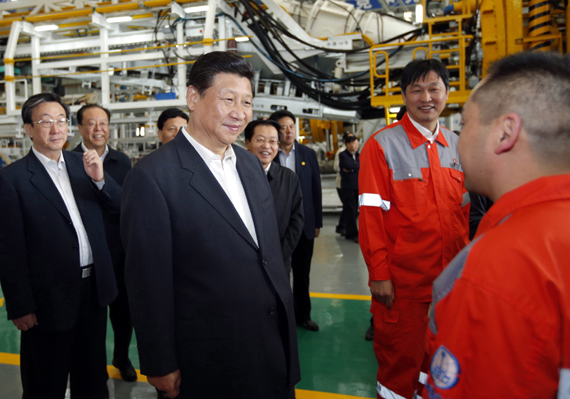在中鐵工程裝備集團有限公司盾構總裝車間,習近平通過模型了解盾構機整體構造和工作原理,然后登上一座85米長的盾構機裝配平臺,察看了裝配情況。他向現場科技人員和職工問好,對他們攻克科研難題、突破盾構機系統集成技術壁壘的自主創新給予肯定。習近平指出,裝備制造業是一個國家制造業的脊梁,目前我國裝備制造業還有許多短板,要加大投入、加強研發、加快發展,努力占領世界制高點、掌控技術話語權,使我國成為現代裝備制造業大國。一個地方、一個企業,要突破發展瓶頸、解決深層次矛盾和問題,根本出路在于創新,關鍵要靠科技力量。要加快構建以企業為主體、市場為導向、產學研相結合的技術創新體系,加強創新人才隊伍建設,搭建創新服務平臺,推動科技和經濟緊密結合,努力實現優勢領域、共性技術、關鍵技術的重大突破,推動中國制造向中國創造轉變、中國速度向中國質量轉變、中國產品向中國品牌轉變。