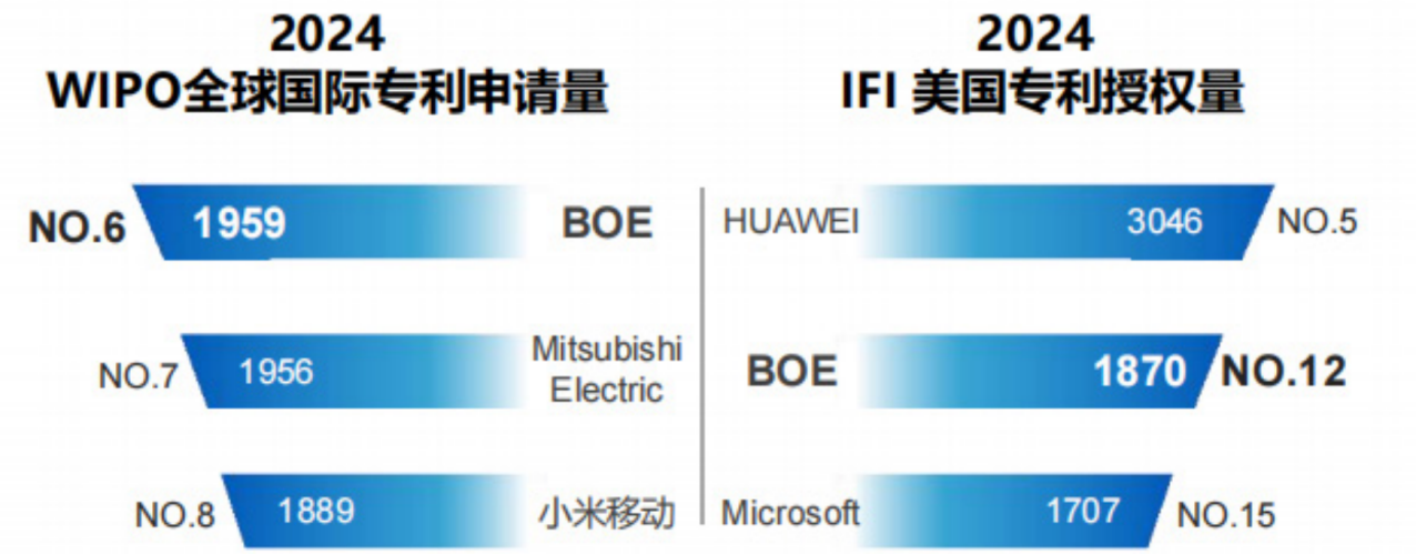 二是注重專利標(biāo)準(zhǔn)布局。堅(jiān)持“以質(zhì)為主、量質(zhì)并舉”的全球?qū)@季植呗浴=刂?024年,累計(jì)自主專利申請(qǐng)超10萬(wàn)件,其中發(fā)明專利超90%,海外專利超33%,覆蓋美國(guó)、歐洲、日本、韓國(guó)等多個(gè)國(guó)家和地區(qū),遍及柔性O(shè)LED、傳感、人工智能、大數(shù)據(jù)等多領(lǐng)域;連續(xù)7年躋身IFI美國(guó)專利授權(quán)排行榜全球TOP20,連續(xù)9年進(jìn)入PCT國(guó)際專利申請(qǐng)全球前10。累計(jì)主持并參與制修訂國(guó)內(nèi)外技術(shù)標(biāo)準(zhǔn)429項(xiàng),加速?gòu)募夹g(shù)創(chuàng)新引領(lǐng)者向行業(yè)標(biāo)準(zhǔn)制定者邁進(jìn)。